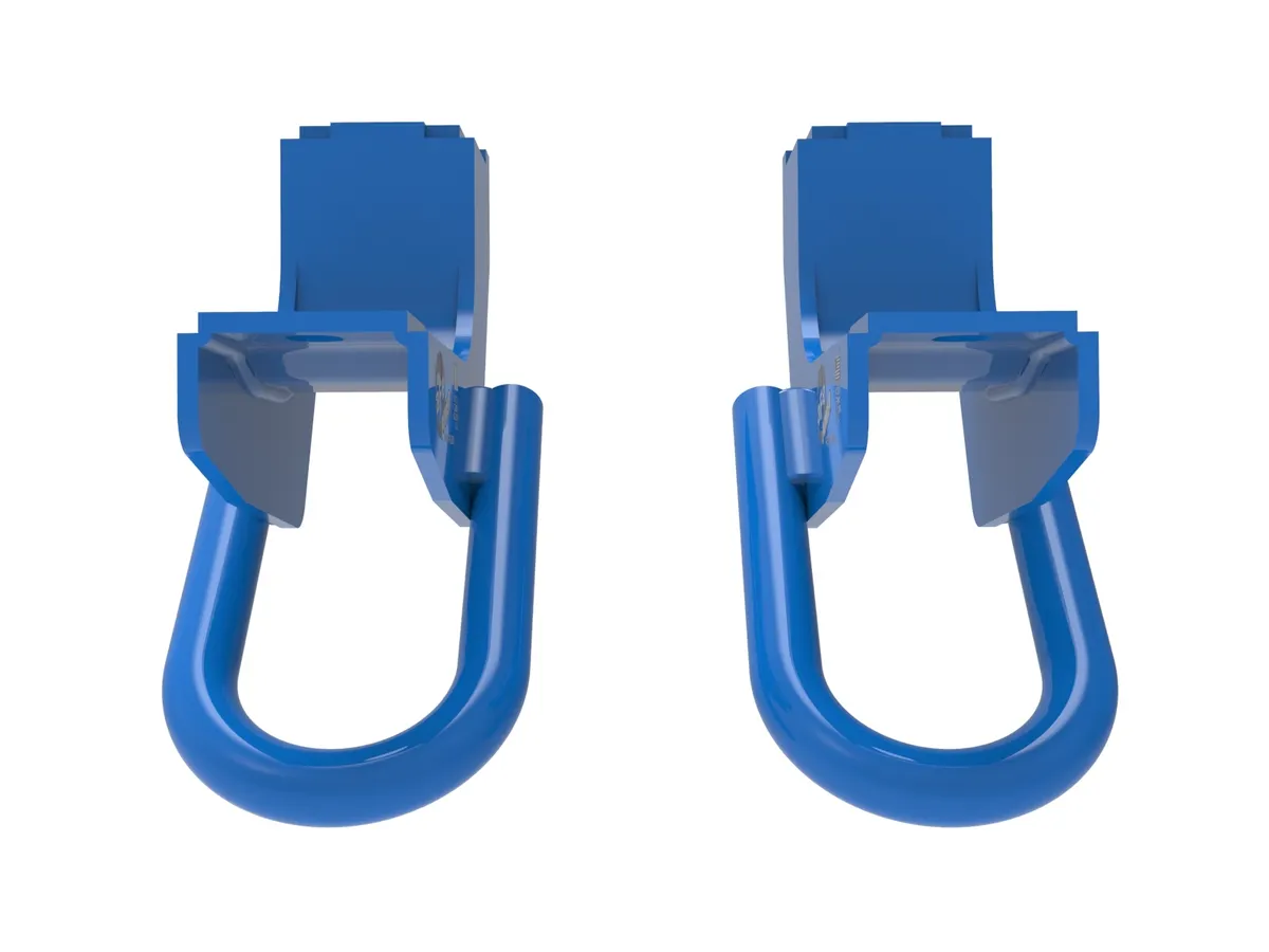 Add dedicated front recovery points to your Toyota Tundra. aFe POWER Tow Loops mount directly to the frame and are much safer than the factory tie-down loop when towing or recovering a stuck vehicle. The 3/4 IN solid steel loop is designed to safely withstand and distribute heavy loads allowing access to several recovery attachments for a strong and durable recovery point. Powder-coated blue so they are easily recognized in the elements during off-road adventures.