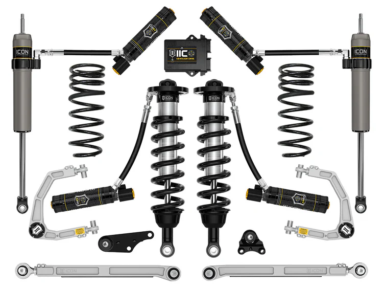 ICON Vehicle Dynamics 2024-2025 Toyota Tacoma suspension systems are designed with maximum performance and the serious driver in mind. ICON engineers’ primary focus is to increase wheel travel and damping ability, which translates into outstanding vehicle control and ride quality both on- and off-road. This Stage 10 system includes vehicle-specific tuned 2.5 Series coilover shocks featuring CDEV equipped remote reservoirs and ICON-engineered coil springs for superior vehicle “feel” through the range of travel. Remote reservoirs greatly increase shock oil volume and heat dissipation surface area to resist overheating and cavitation under hard use, which can lead to damper fade. Focus on driving and let ICON Intelligent Control (IIC) read the terrain and make near-instant adjustments via the Compression Damping Electronic Valve (CDEV) at each individual shock. Control the system wirelessly through the IIC app on your phone and once configured the system functions without driver input. These coilovers are also height adjustable from 1.25-3” of front lift height over stock, allowing the use of larger, more aggressive wheel and tire combinations. The front differential drop brackets and ICON’s specifically designed coilover lengths maximizes the available front suspension travel and prevent CV bind. Additionally, polyurethane differential mounting bushings replace the soft OE bushings to help limit differential movement under load.