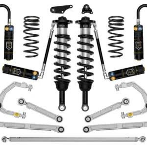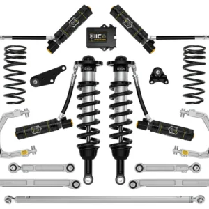 ICON Vehicle Dynamics 2024-2025 Toyota Tacoma suspension systems are designed with maximum performance and the serious driver in mind. ICON engineers’ primary focus is to increase wheel travel and damping ability, which translates into outstanding vehicle control and ride quality both on- and off-road. This Stage 2 system includes vehicle-specific tuned 2.5 Series coilover shocks featuring internal reservoirs for exceptional cooling properties and ICON-engineered coil springs for superior vehicle “feel” through the range of travel. These coilovers are height adjustable from 1.25-3” of front lift height over stock, allowing the use of larger, more aggressive wheel and tire combinations. The combination of front differential drop brackets and ICON’s specifically designed coilover lengths maximizes the available front suspension travel and prevent CV bind. Additionally, polyurethane differential mounting bushings replace the soft OE bushings to help limit differential movement under load. The included ICON tubular upper control arm kit is designed to improve the overall performance of the new 2024-2025 Toyota Tacoma with corrected front-end geometry, built in additional caster, and improved suspension component clearance. Additionally, replacing the OE ball joint with the all-new, serviceable, and rebuildable ICON Delta Joint PRO allows for full bump and droop travel of the front suspension while eliminating bind.