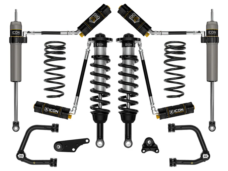ICON Vehicle Dynamics 2024-2025 Toyota Tacoma suspension systems are designed with maximum performance and the serious driver in mind. ICON engineers’ primary focus is to increase wheel travel and damping ability, which translates into outstanding vehicle control and ride quality both on- and off-road. This Stage 5 system includes vehicle-specific tuned 2.5 Series coilover shocks featuring CDCV equipped remote reservoirs and ICON-engineered coil springs for superior vehicle “feel” through the range of travel. Remote reservoirs greatly increase shock oil volume and heat dissipation surface area to resist overheating and cavitation under hard use, which can lead to damper fade. The included ICON CDC Valves are externally adjustable valves that restricts oil flow into the reservoir which creates 10 levels of compression damping force ranges. These coilovers are also height adjustable from 1.25-3” of front lift height over stock, allowing the use of larger, more aggressive wheel and tire combinations. The combination of front differential drop brackets and ICON’s specifically designed coilover lengths maximizes the available front suspension travel and prevent CV bind. Additionally, polyurethane differential mounting bushings replace the soft OE bushings to help limit differential movement under load.