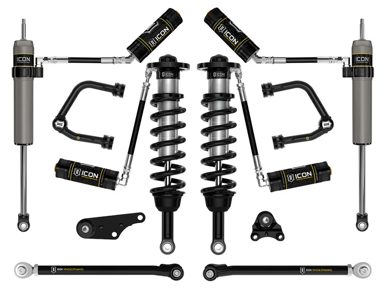 ICON Vehicle Dynamics 2024-2025 Toyota Tacoma suspension systems are designed with maximum performance and the serious driver in mind. ICON engineers’ primary focus is to increase wheel travel and damping ability, which translates into outstanding vehicle control and ride quality both on- and off-road. This Stage 7 system includes vehicle-specific tuned 2.5 Series coilover shocks featuring remote reservoirs and ICON-engineered coil springs for superior vehicle “feel” through the range of travel. Remote reservoirs greatly increase shock oil volume and heat dissipation surface area to resist overheating and cavitation under hard use, which can lead to damper fade. These coilovers are also height adjustable from 1.25-3” of front lift height over stock, allowing the use of larger, more aggressive wheel and tire combinations. The combination of front differential drop brackets and ICON’s specifically designed coilover lengths maximizes the available front suspension travel and prevent CV bind. Additionally, polyurethane differential mounting bushings replace the soft OE bushings to help limit differential movement under load.