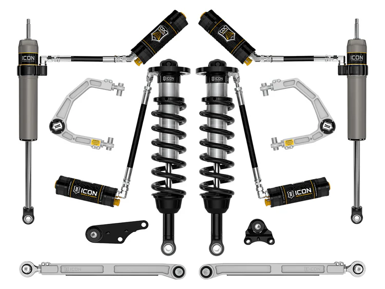 ICON Vehicle Dynamics 2024-2025 Toyota Tacoma suspension systems are designed with maximum performance and the serious driver in mind. ICON engineers’ primary focus is to increase wheel travel and damping ability, which translates into outstanding vehicle control and ride quality both on- and off-road. This Stage 8 system includes vehicle-specific tuned 2.5 Series coilover shocks featuring CDCV equipped remote reservoirs and ICON-engineered coil springs for superior vehicle “feel” through the range of travel. Remote reservoirs greatly increase shock oil volume and heat dissipation surface area to resist overheating and cavitation under hard use, which can lead to damper fade. The included ICON CDC Valves are externally adjustable valves that restricts oil flow into the reservoir which creates 10 levels of compression damping force ranges. These coilovers are also height adjustable from 1.25-3” of front lift height over stock, allowing the use of larger, more aggressive wheel and tire combinations. The combination of front differential drop brackets and ICON’s specifically designed coilover lengths maximizes the available front suspension travel and prevents CV bind. Polyurethane differential mounting bushings replace the soft OE bushings to help limit differential movement under load.