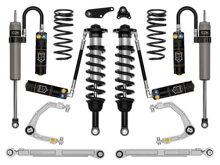 - All shock absorbers equipped with ICON CDXS for independent adjustability of high speed and low speed compression force for handling response and aggressiveness